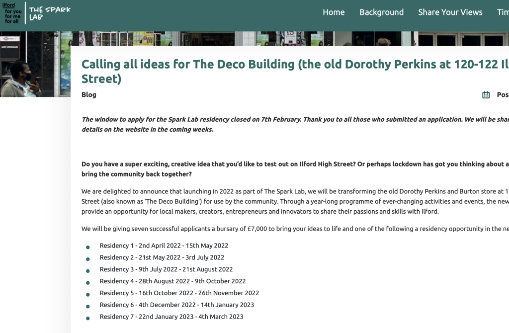 Having no income at the moment, I have been keen to explore ways for the project to earn money. At the start of January I came across this callout for community projects to take place in an old Dorothy Perkins on Ilford High Street. Participants would be given a grant of £7000 to set up a community project for six weeks.